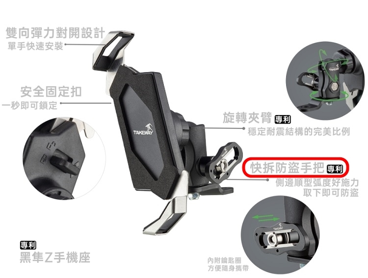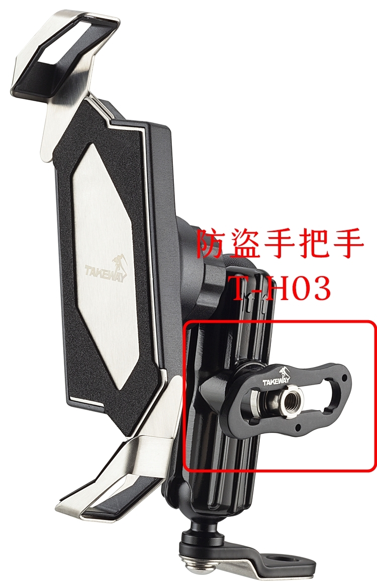 ●【品名】台灣製TAKEWAY極限運動夾和黑隼Z手機座LA3系列用防盜手把T-H03黑色(附鑰匙圈)適LA3-PH05和HAWK1