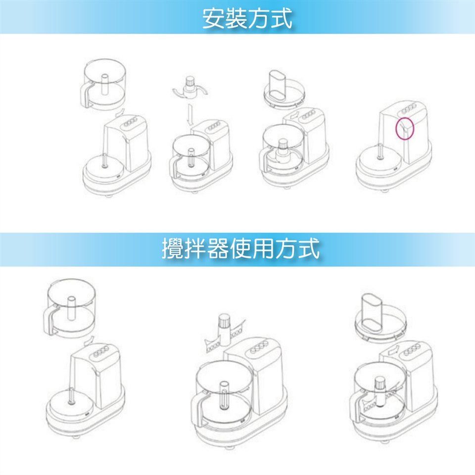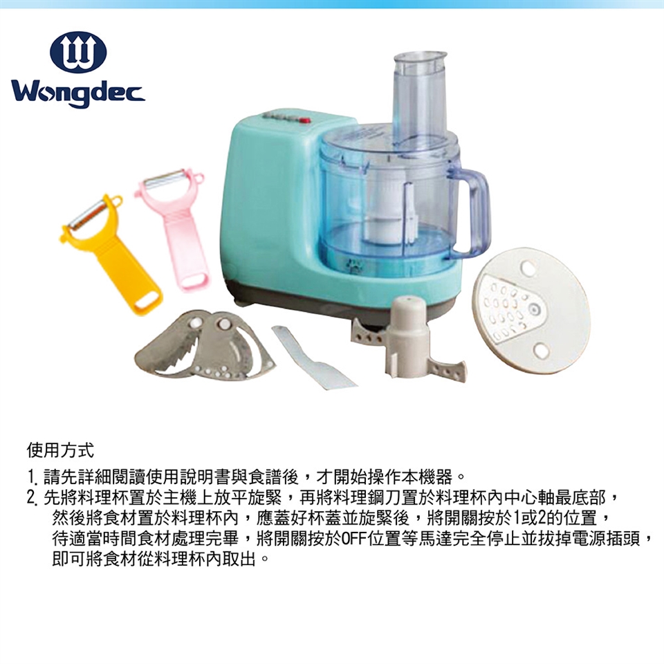 - 使用壓汁、切絲、切片、切條、攪拌,配件必須壓至定位,嚴禁使用1(高)速或自動開關。