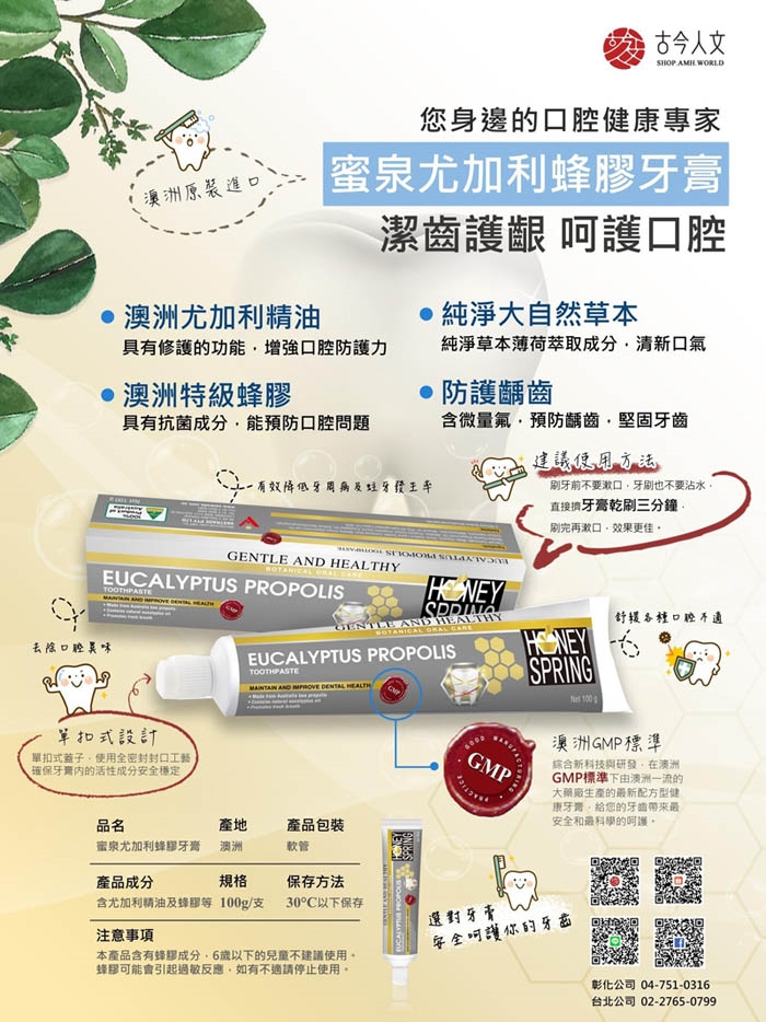 商品詳細介紹 使用方法說明 使用本商品每天至少刷牙兩次,並配合正確的刷牙方法。建議刷牙前 請勿漱口,牙刷也不要沾水,直接擠牙膏乾刷效果最佳,每次刷牙不少於3分鐘。 注意事項 ※注意事項:蜂膠可能會引起過敏反應,如發生口腔或咽喉腫痛,應停止使用。