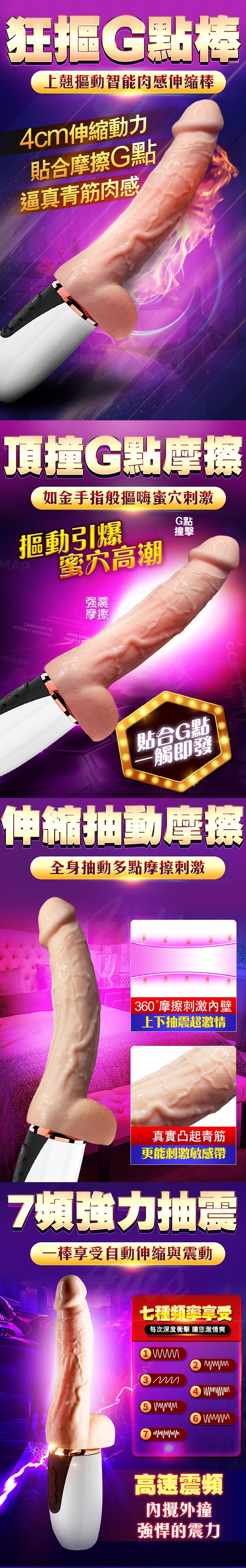 伸縮仿真抽動按摩棒可直接刺激G點,頭部震動可刺激G點,產生不一樣的快感體驗。擁有7段伸縮變頻讓您體驗多種不同性愛模式。