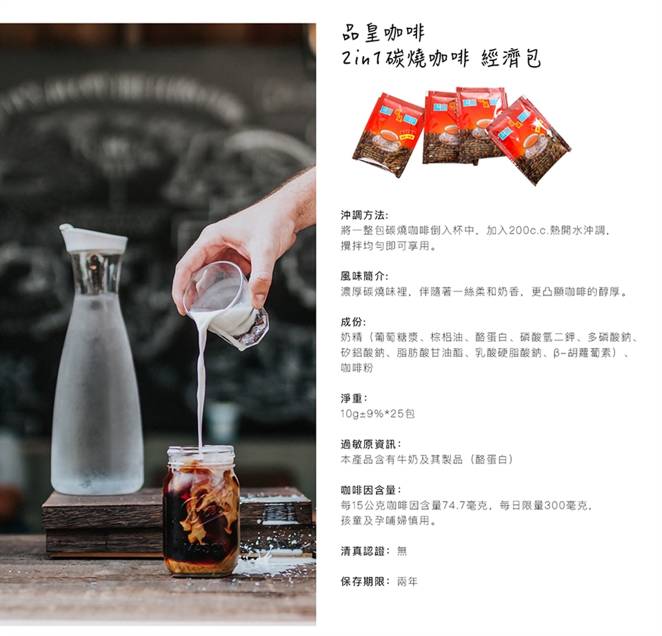 將一整包碳燒咖啡倒入杯中,加入200c.c.熱開水沖調,攪拌均勻即可享用。