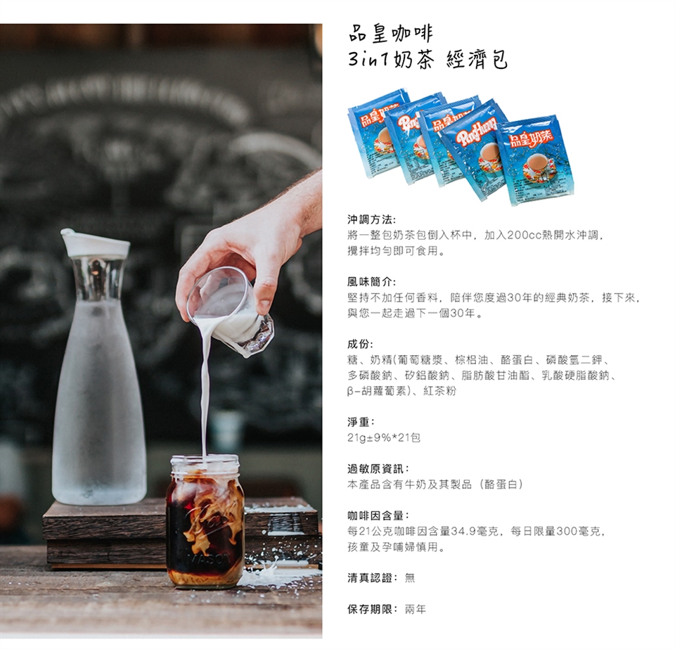 將一整包奶茶包倒入杯中,加入200cc熱開水沖調,攪拌均勻即可食用。