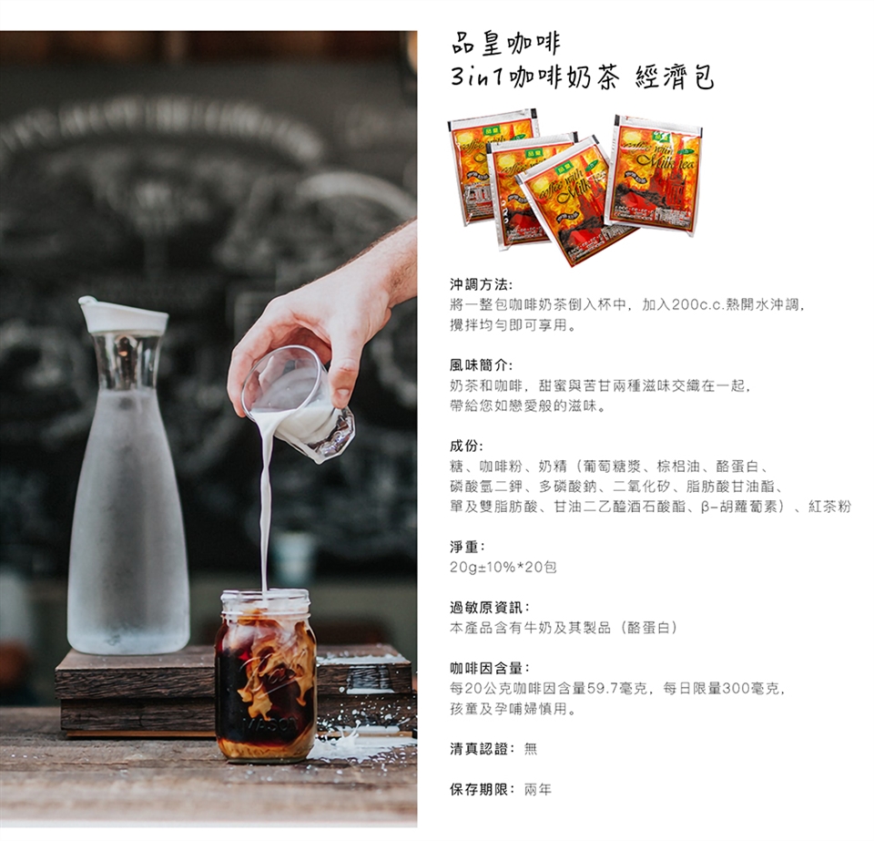 將一整包咖啡奶茶倒入杯中,加入200c.c.熱開水沖調,攪拌均勻即可享用。