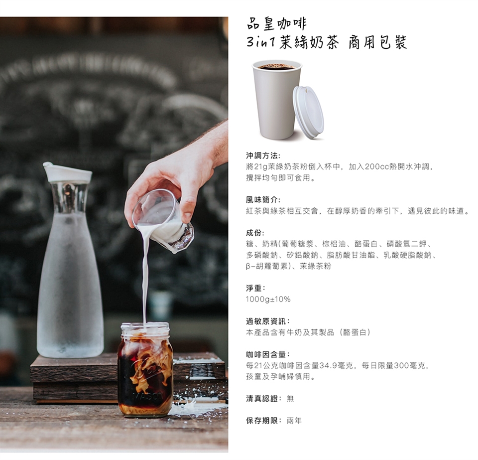 將21g茉綠奶茶粉倒入杯中,加入200cc熱開水沖調,攪拌均勻即可食用。