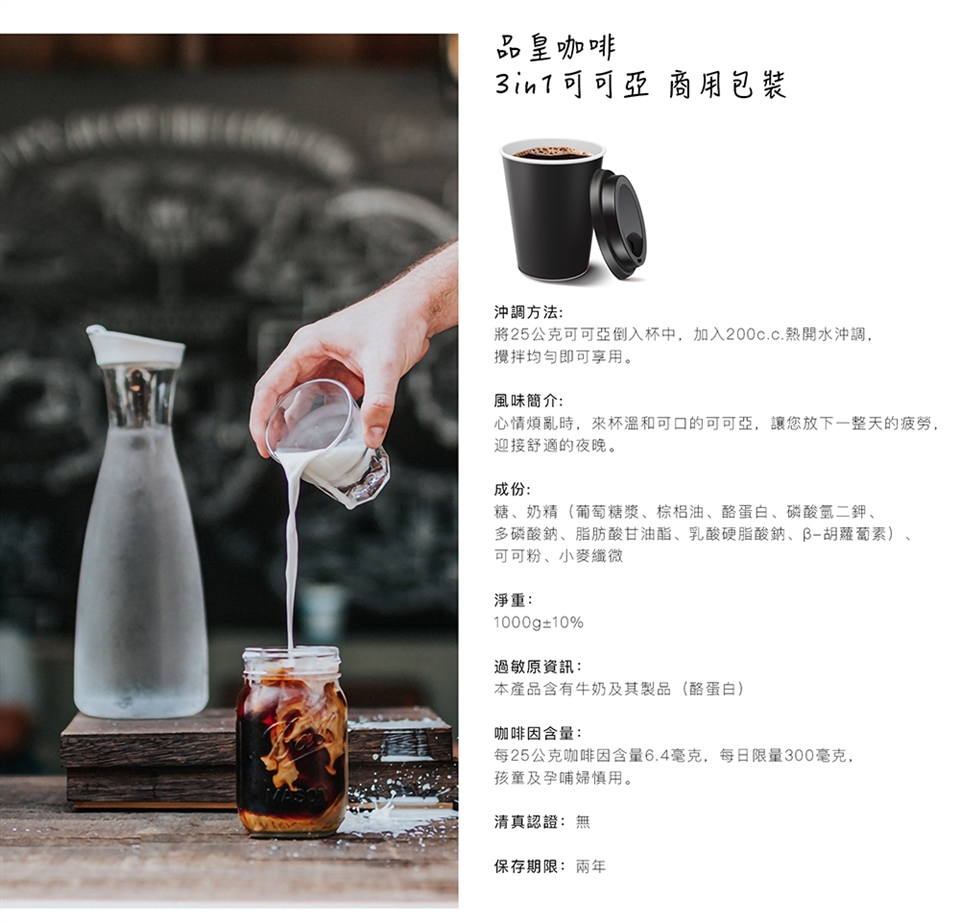 將25公克可可亞倒入杯中,加入200c.c.熱開水沖調,攪拌均勻即可享用。
