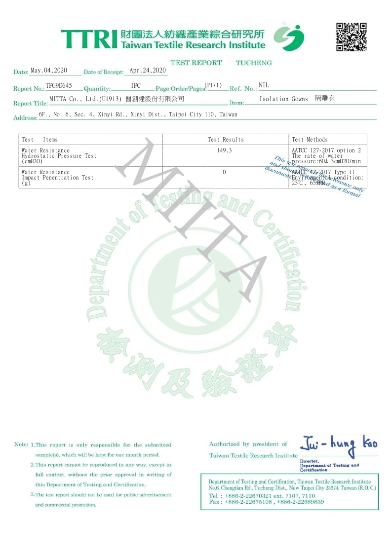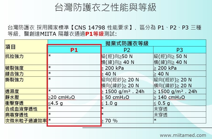 *通過台灣紡研所(TTRI) P1 防護衣等級測試(CNS 14798 T5019)。
