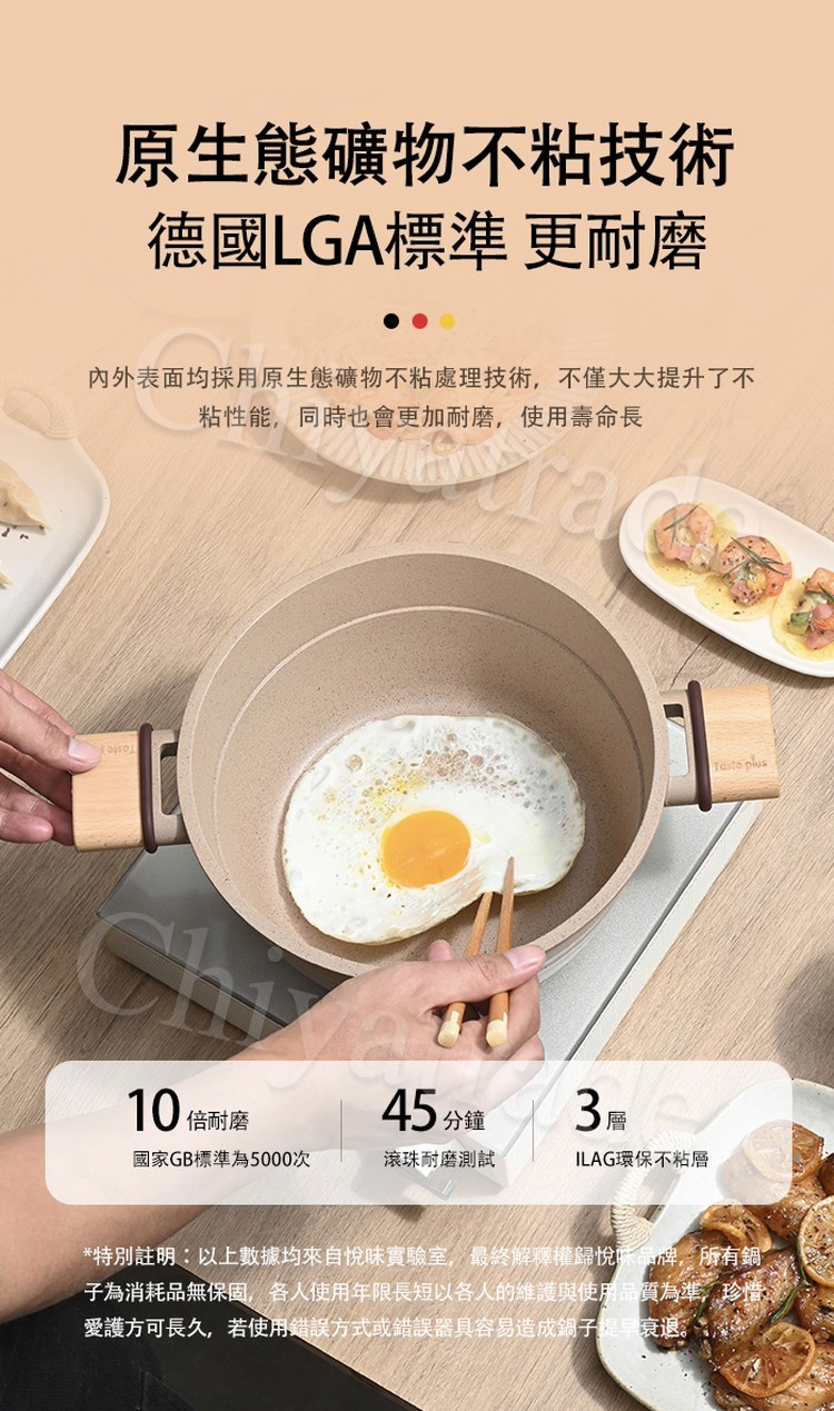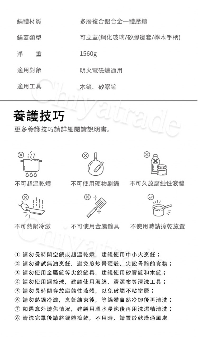 溫馨提醒:切勿高溫乾燒大火烹飪、金屬物磨損、熱鍋冷水清洗,