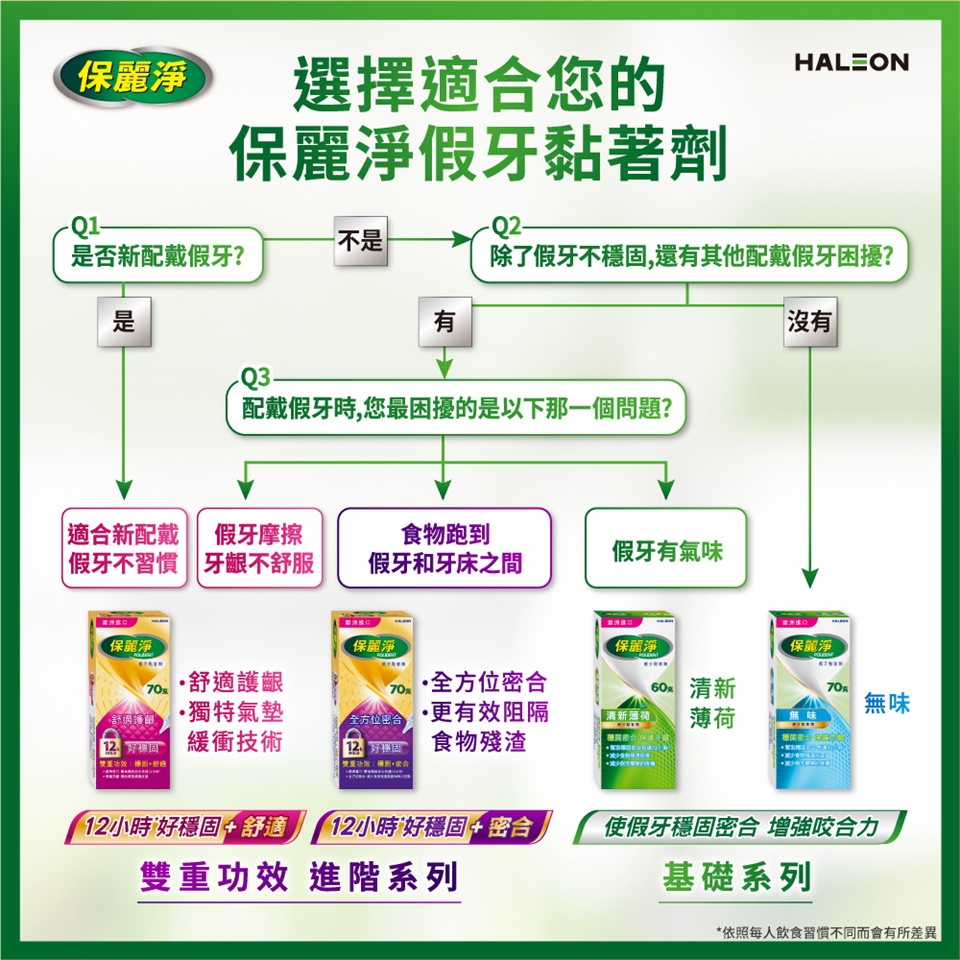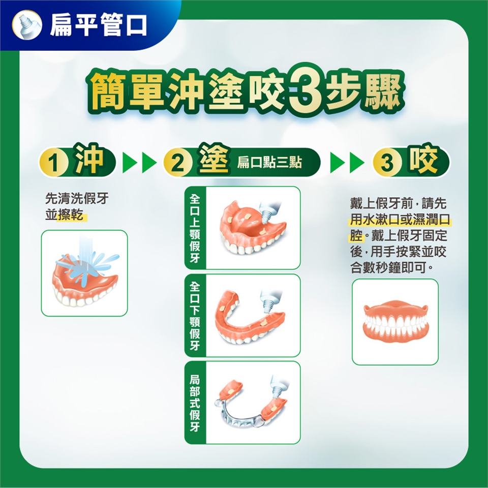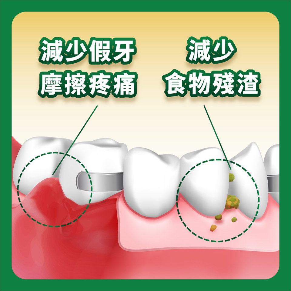 4. 戴假牙前請先潤濕口腔,戴上假牙固定後,緊咬數秒鐘後即可。