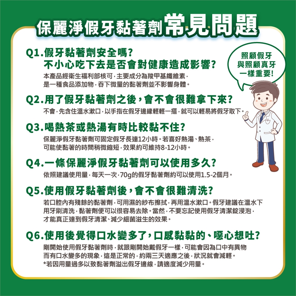 4.一天使用一次即可使假牙穩固密合。若有需要使用一次以上,請諮詢牙醫師是否有假牙密合的問題。