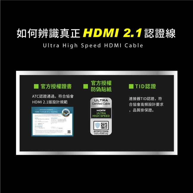 ◎真正HDMI 2.1認證線需具備:(1)官方授權證書(2)官方授權防偽貼紙(3)TID號碼:HDG46B19Z-H1-00-A