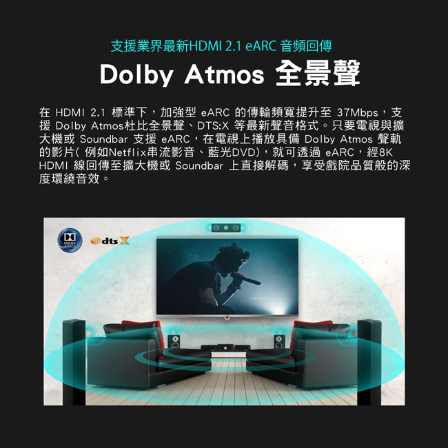 ◎完美環繞音效eARC,支援Dolby Atmos, DTS x環繞聲訊號