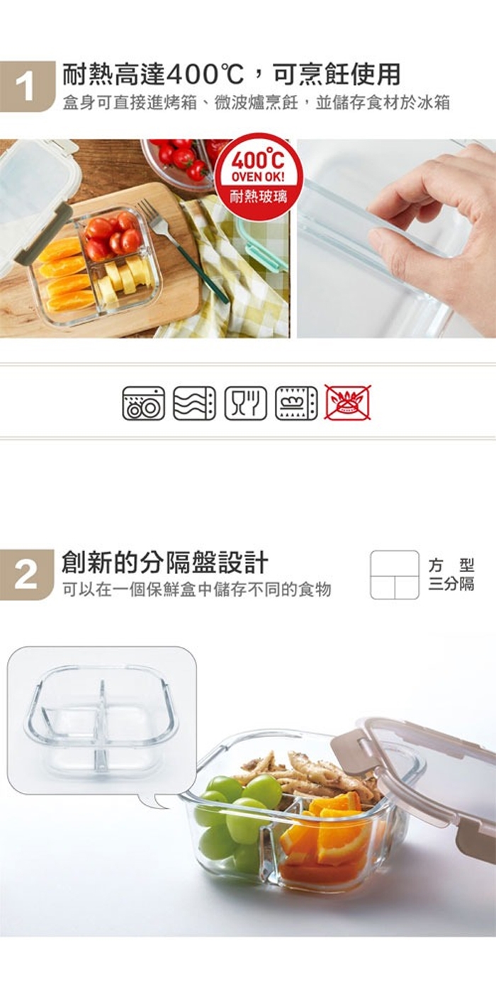 ◎ 盒身-硅硼酸耐熱玻璃 / 上蓋-聚丙烯(PP) / 密封條-矽膠(耐高溫、抗酸鹼)