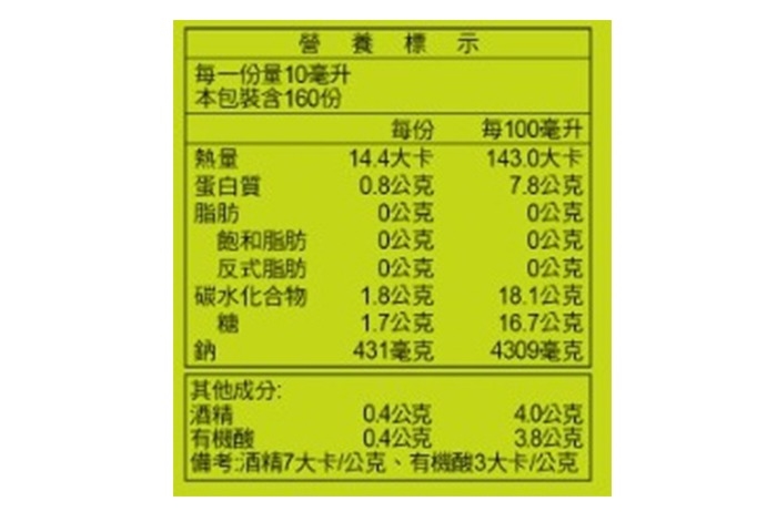 | 內容物成份 | 水、轉化液糖(蔗糖、水)、脫脂大豆(非基因改造)、小麥、食鹽、酒精、酵母抽出物 |