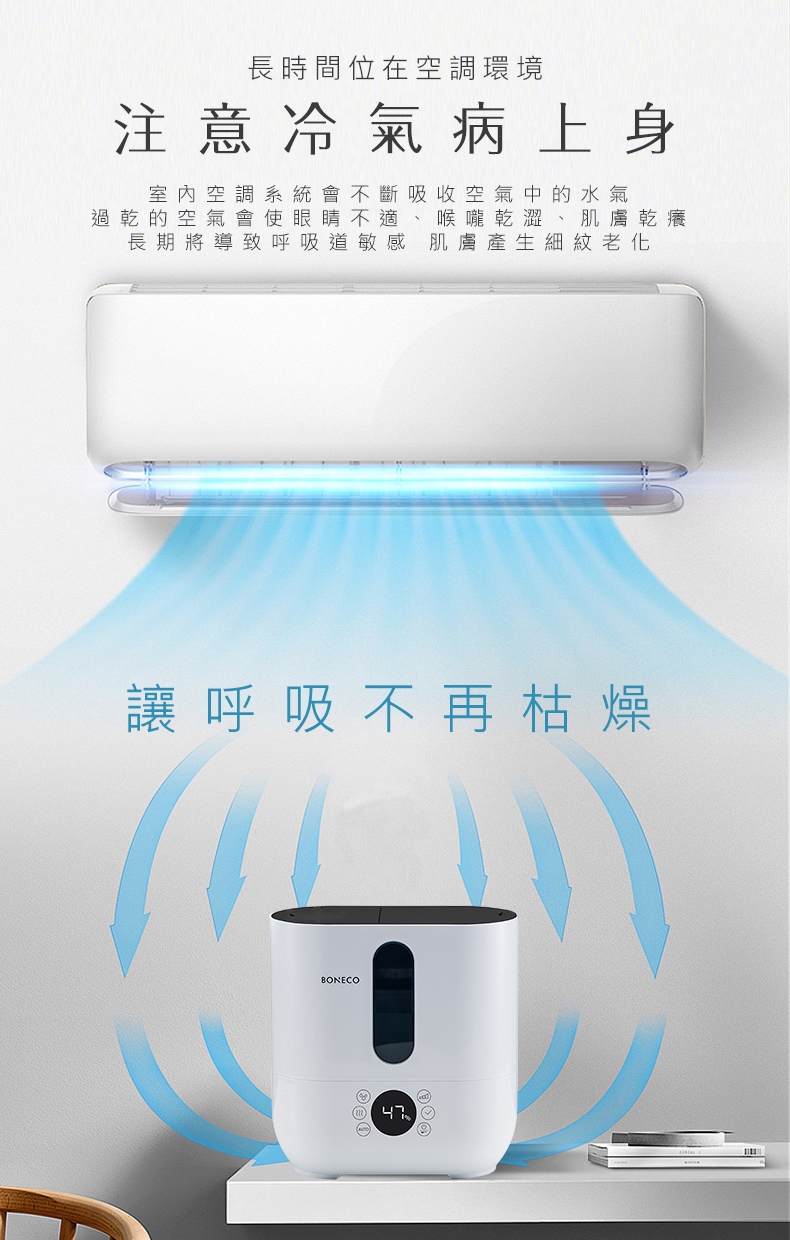 1. 一般人都忽略長期待在冷氣房內,濕度往往都遠低於標準值以下很多,也因此造就了很多過敏兒,使用加濕器可以維持室內的濕度,人在冷氣房中可以獲得舒適的空氣品質,防止皮膚乾燥,預防上班族的通病『冷氣病』。