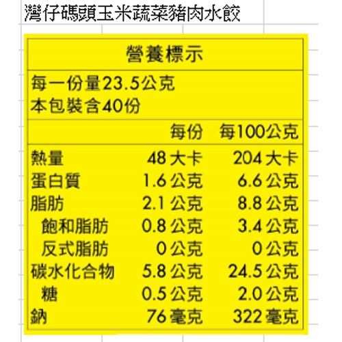 商品名稱 灣仔碼頭玉米蔬菜豬肉水餃x40粒