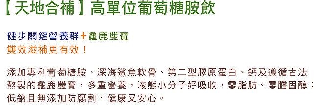 | 商品名稱 | 天地合補高單位葡萄糖胺飲 | |