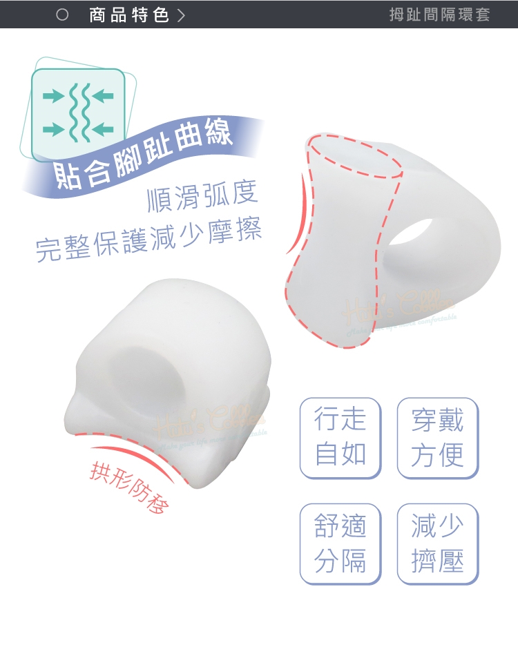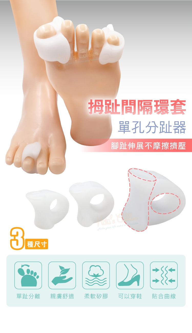 2.柔軟矽膠:親膚舒適不刺激,配合腳趾大小擴展,拉伸力好,