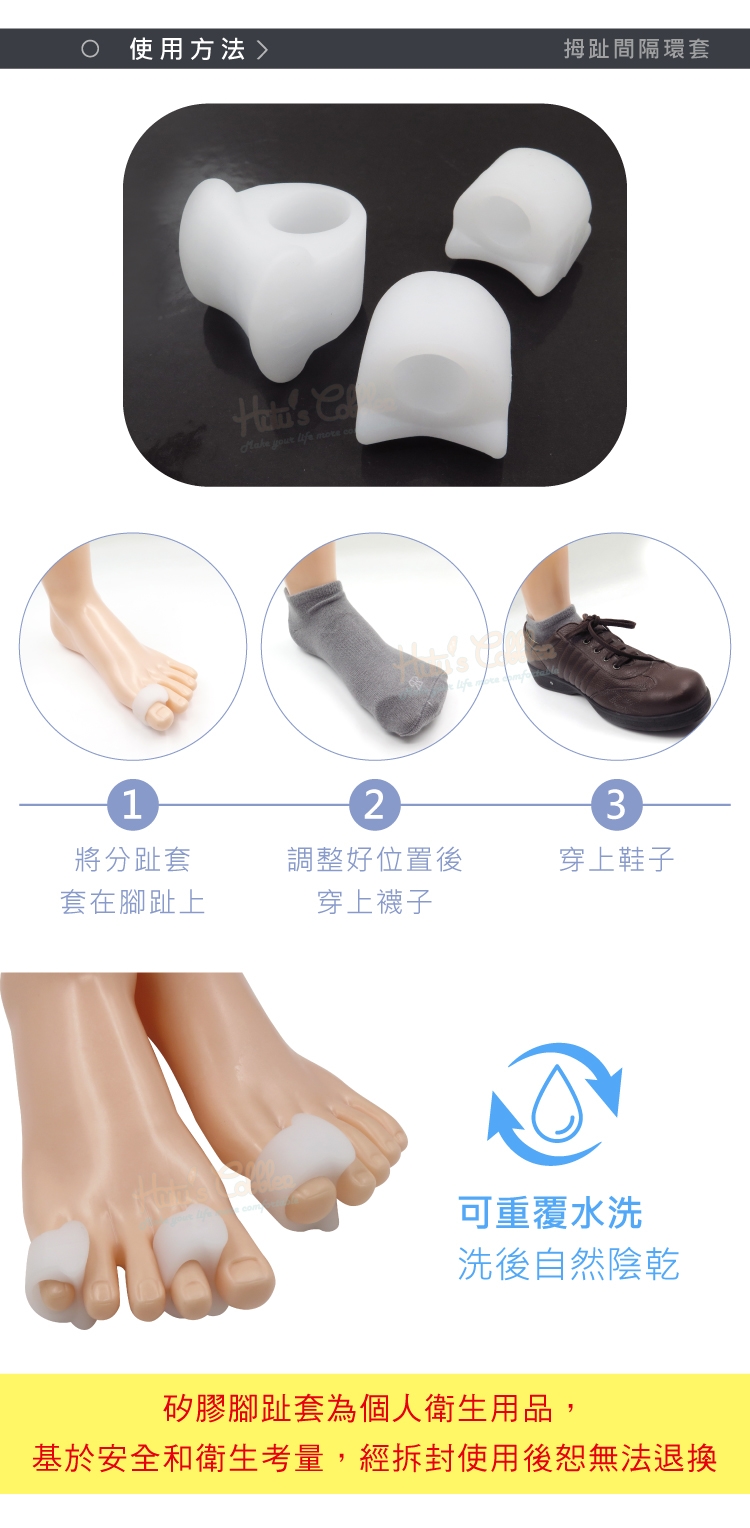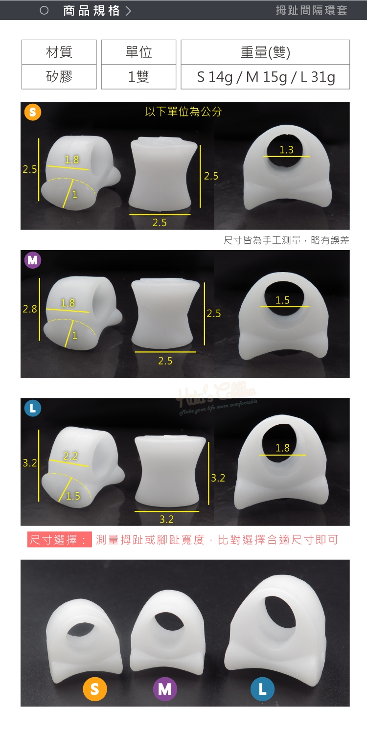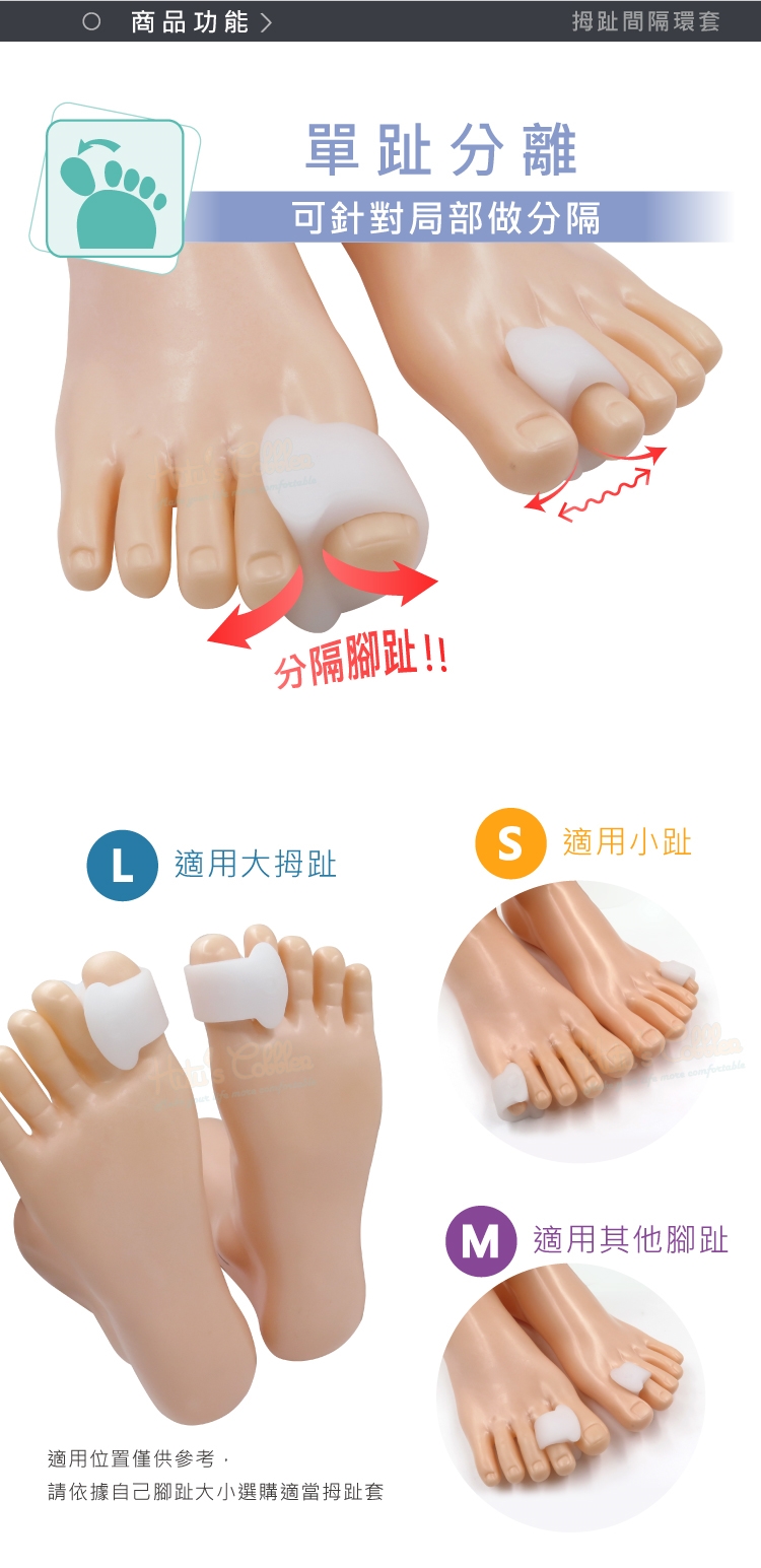 尺寸選擇:測量拇趾或腳指寬度,比對選擇合適尺寸即可