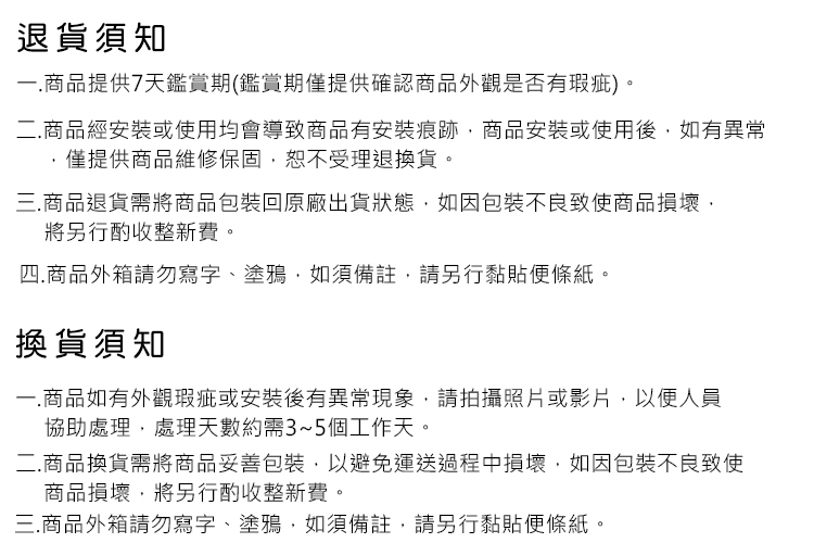 ★產品安裝使用過後,僅提供保固服務,恕無法辦理退換貨 。