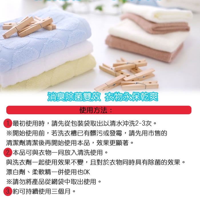 (與洗衣劑一起使用效果不變,且對於衣物同時具有除菌效果。漂白劑、柔軟精一併使用也OK。) ※請勿將產品從網袋中取出使用。