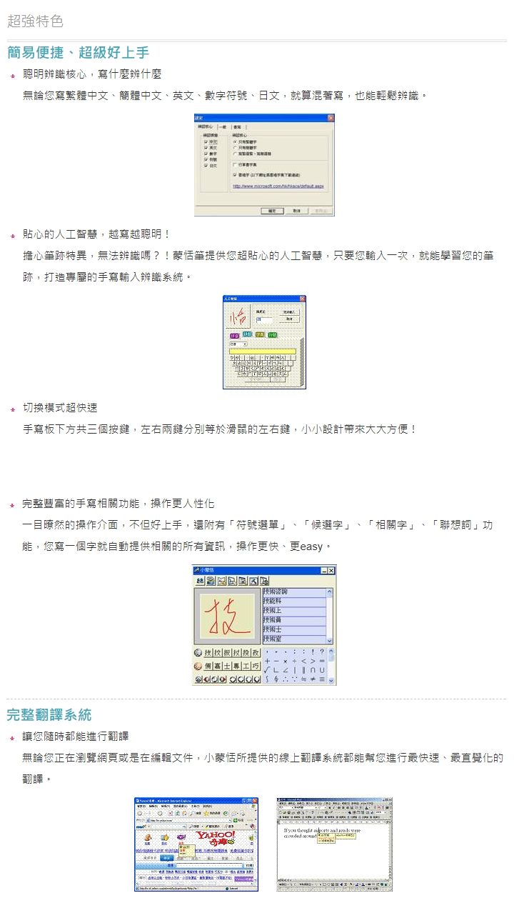 小蒙恬系列提供您操作簡單、輕薄靈巧的不同選擇,辨識率精準,對於初次接觸手寫輸入的您,輕鬆上手沒負擔。輕巧流線的外型,顛覆一般人對於手寫產品笨重的刻板印象,除具備豐富手寫功能外,還能進行中英翻譯,充滿人性化的新選擇;同時多種Office與即時通訊軟體皆能使用。