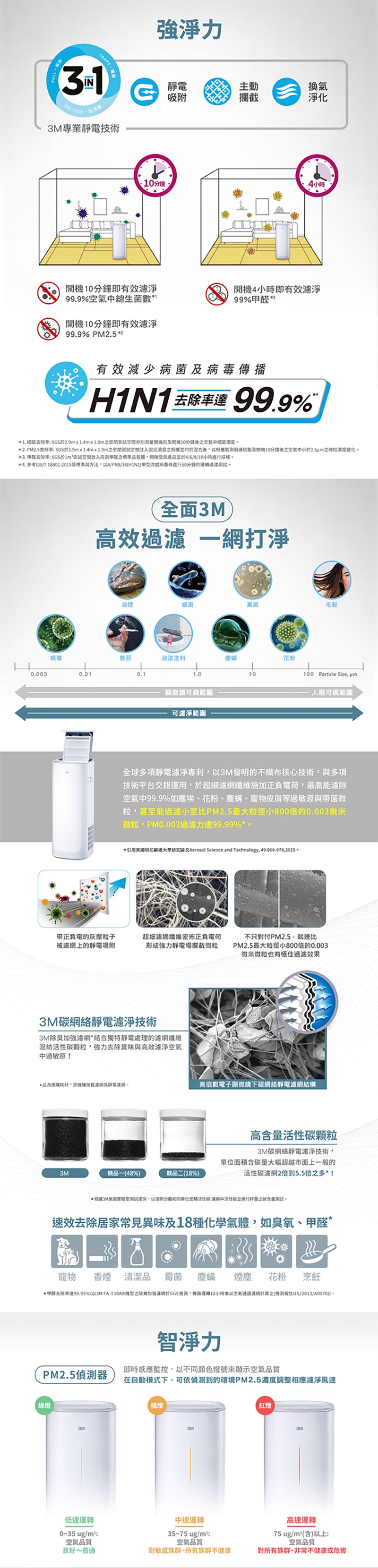 全球逾200項靜電濾淨技術專利,以3M發明的不織布核心技術,與多項技術平台交錯運用,於超細濾網纖維施加正負電荷,最高能濾除空氣中99.9%如塵埃、花粉、塵蹣、寵物毛屑等過敏原與帶菌微粒, 甚至能過濾小至比PM2.5微米還小800倍的PM0.003微米微粒,讓敏感體質的你擺脫潛在的呼吸困擾。