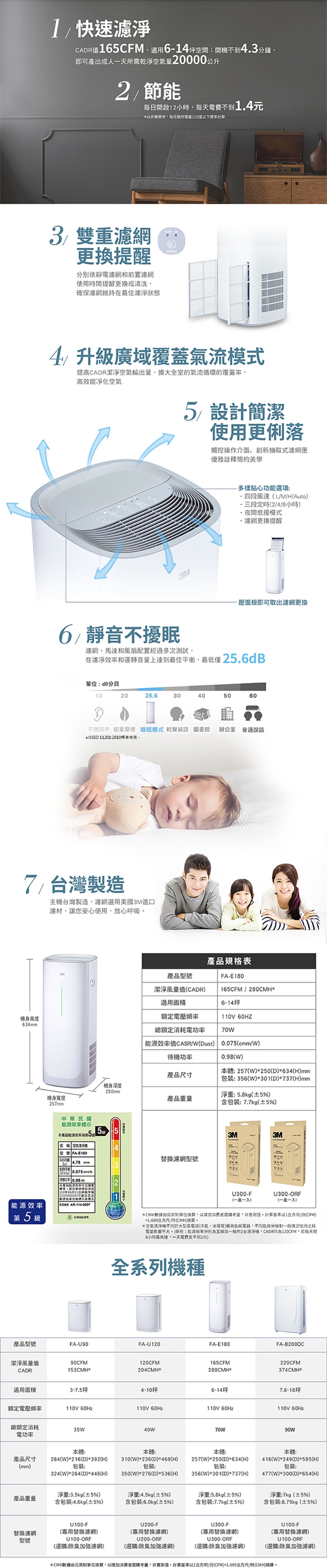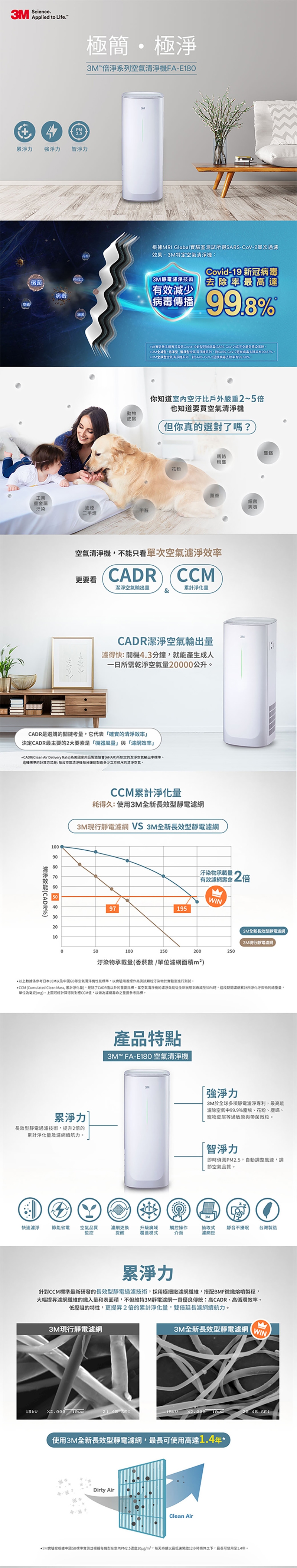 FA-E180使用針對CCM標準最新研發的「長效型靜電過濾技術」,採用極細緻濾網纖維,搭配BMF微織熔噴製程,大幅提昇濾網纖維的織入量和表面積,不但維持3M靜電濾網一貫優良傳統:高CADR、高循環效率、低壓阻的特性,更提昇2倍的累計淨化量,雙倍延長濾網續航力。