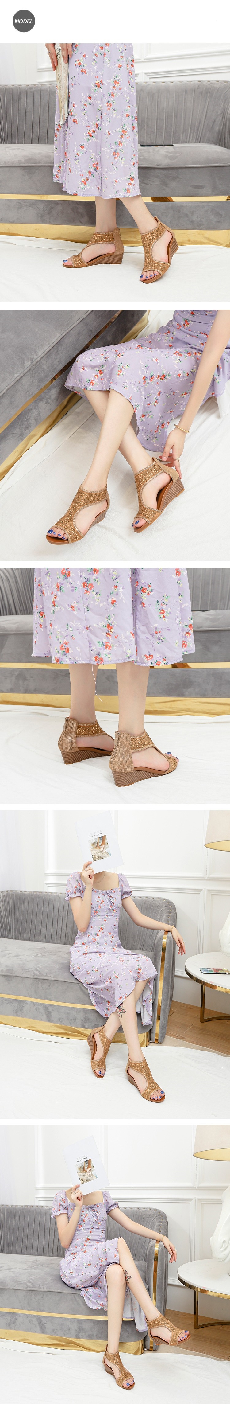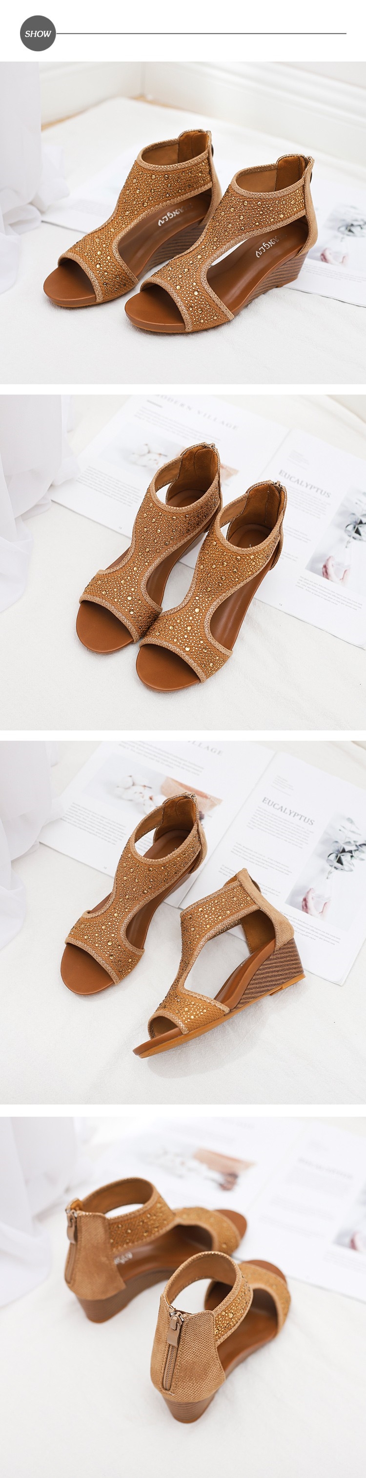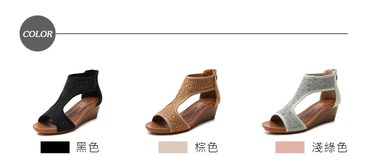 【QUEENA】 鑽飾涼鞋坡跟涼鞋/華麗燙鑽時尚經典波希米亞風坡跟涼鞋 棕