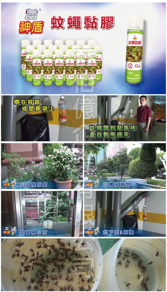 將本品上下搖晃均勻噴灑於空寶特瓶中(可將瓶口割去增加其進入範圍)或直接噴於塑膠板上,再將寶特瓶或塑膠板置於陰涼通風處(建議放排水口處效果更佳),吸引蚊蠅昆蟲黏附其上,達到誘補效果。每個設置點有效作用面積約達50平方公尺,請依實際誘捕範圍大小決定設置黏膠板數目。