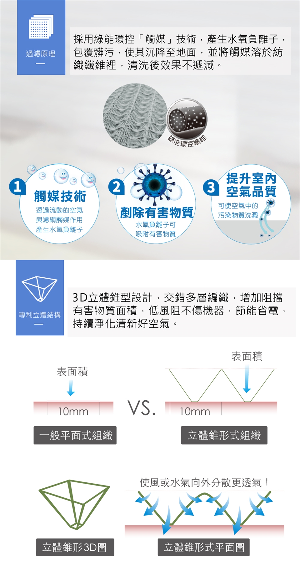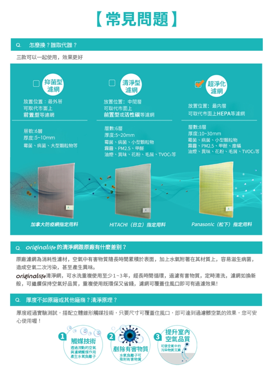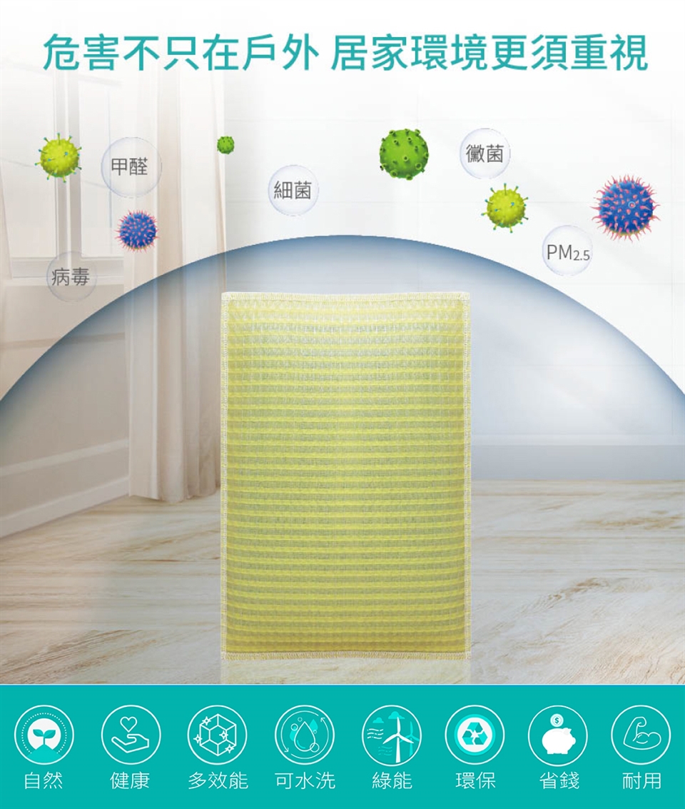 ◎觸媒技術融於紡織纖維裡,清洗皆不影響效果,每洗一次就像新的一片!。