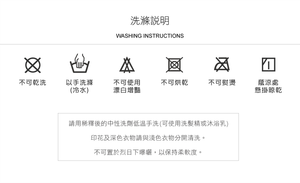 ► 建議可使用洗髮精、沐浴乳(可直接清洗皮膚之清潔產品)或蠶絲專用中性洗劑,使用低溫冷水稀釋過後,不浸泡,輕柔手洗方式進行清潔。