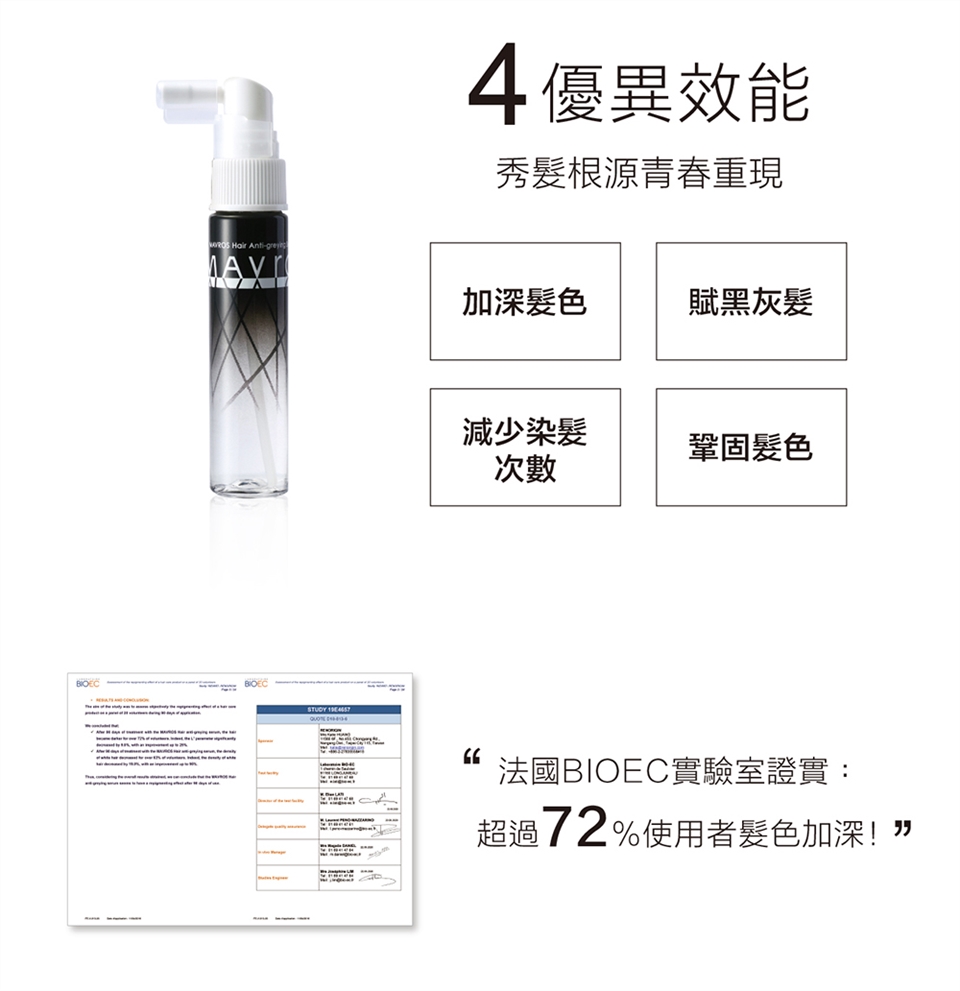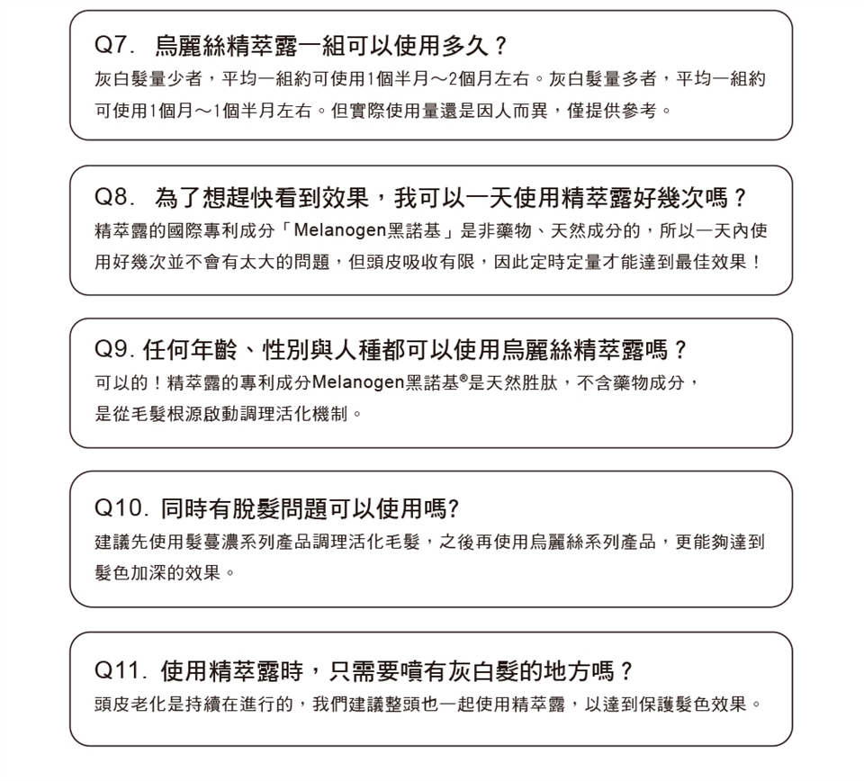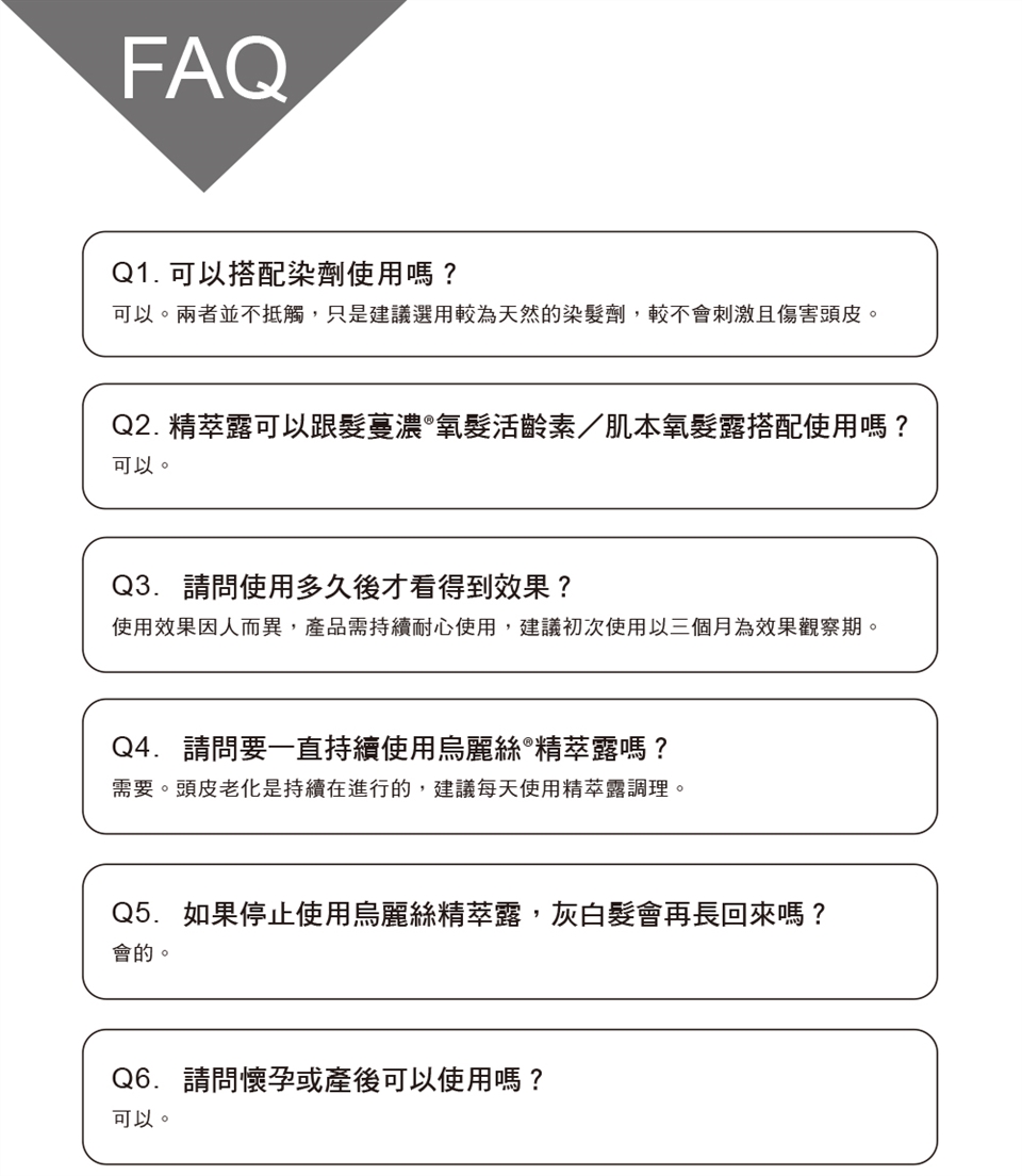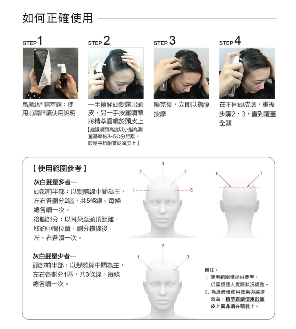 雙手保持清潔,一手撥開頭髮露出頭皮,另一手按壓噴頭將精粹露均勻噴於頭皮上後,立刻以指腹按摩,在不同頭皮處重複同樣動作,直到覆蓋全頭。