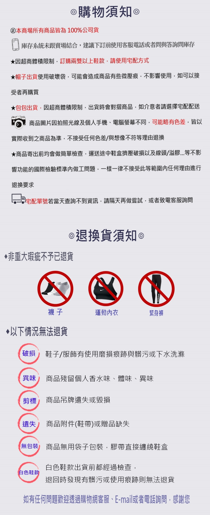 購物須知 : 本店因本身的庫存系統未跟商城結合,建議各位顧客下訂前,br/可以先使用客服電話或者LINE客服聯絡,br/確定有您的尺寸再下訂,若下單前未先聊聊詢問,我們可能會請買家協助取消訂單。br/訂購【兩雙以上】鞋子商品,請使用【宅配】方式,超商因材積問題無法配送。br/br/商品圖片顏色可能因為拍照光線及個人手機、電腦螢幕不同,br/可能略有色差,商品皆以實際收到商品為準,請先行考慮後再下訂。br/br/★帽子出貨,包裝使用破壞袋,運送過程中難免會造成商品有些微壓痕,不影響使用,如可以接受者再購買。br/★包包出貨,因超商體積限制,出貨都會對摺,如可以接受再購買。br/br/br/本商品皆為正品公司貨。br/br/退換貨須知:br/申請退換貨服務時,請確定商品本身與包裝皆完好。br/1. 請勿產生使用後之損壞、消耗或髒汙。br/2. 請勿有使用後產生髒污痕跡或者個人香水味、體位、異味br/3. 請勿經過不可恢復之處理,如下水清潔br/4. 請勿剪去吊牌/包裝袋,br/5. 商品配件(如鞋帶) 請勿遺失br/6. 請勿穿出室外、請勿清洗維修等。br/br/退貨時請注意切勿直接黏貼/書寫文字於商品包裝盒/袋上,br/並將商品恢復收貨時原包裝,(例如:用一個包裝袋包裝起來)br/br/#運動世界 #運動品牌 #台灣正品公司貨br/br/如有任何問題歡迎透過客服、Email或者電話詢問,感謝您br/Email : sportworld5566@yahoo.com 或客服電話 06-6371518 / 0909420389
