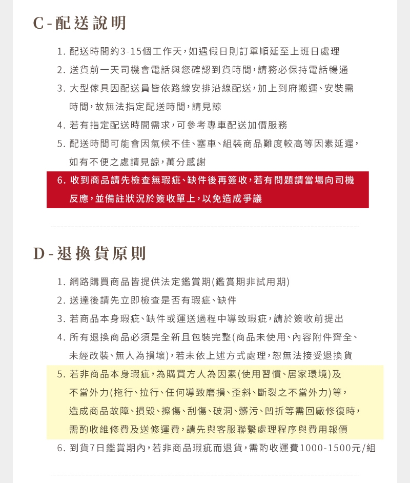 因應一例一休,貨運假日/國定假日/皆不配送。