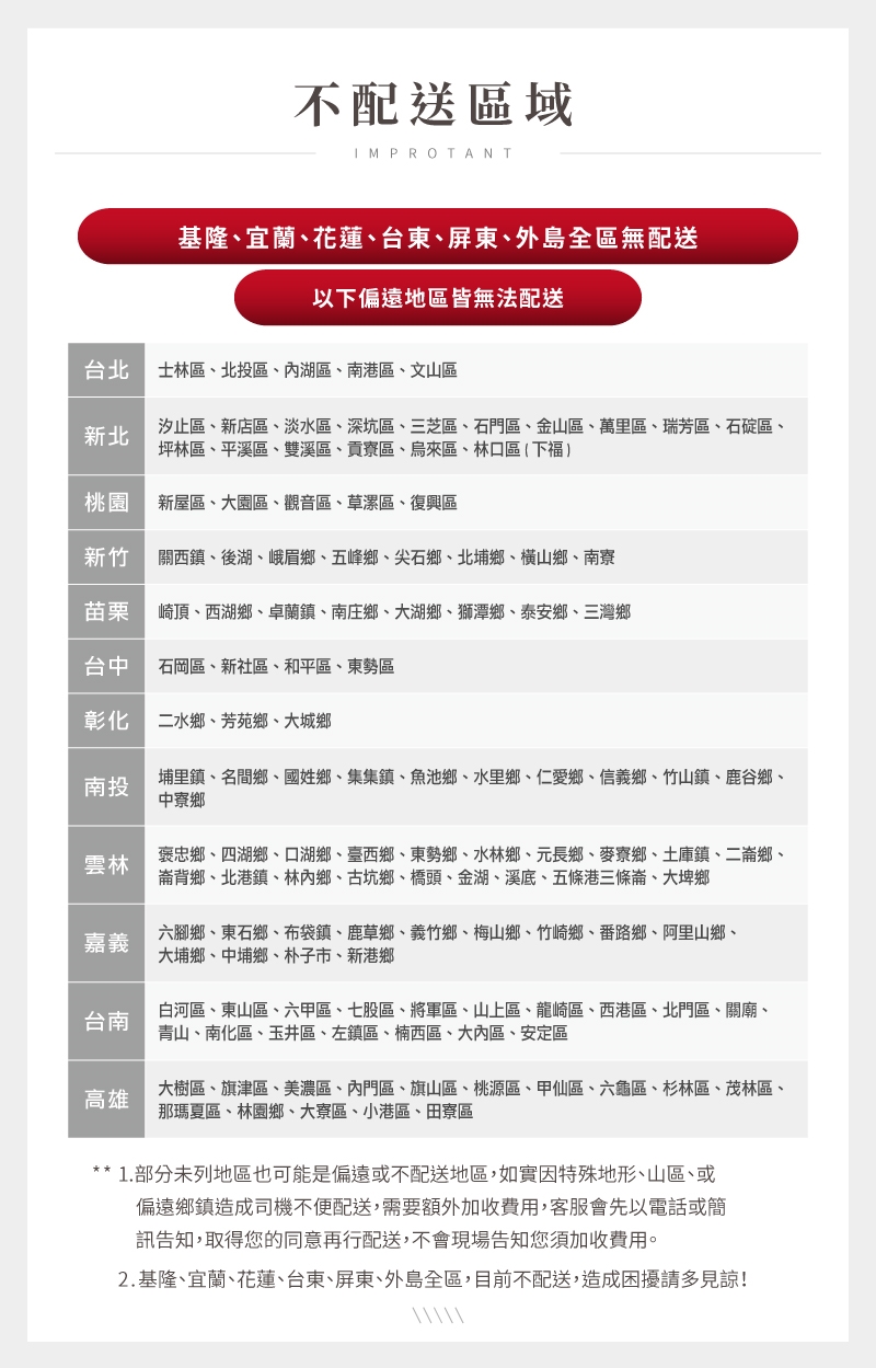 *偏遠地區/山區,配送需另加運費,將由專人與你電話聯繫,外島不配送。
