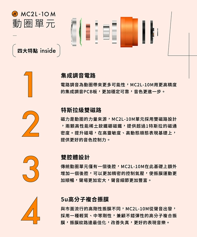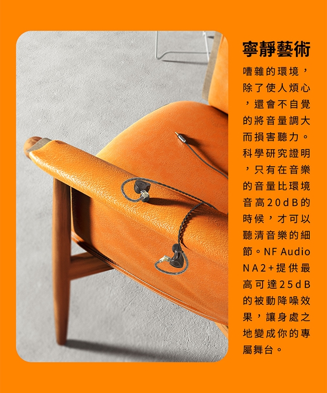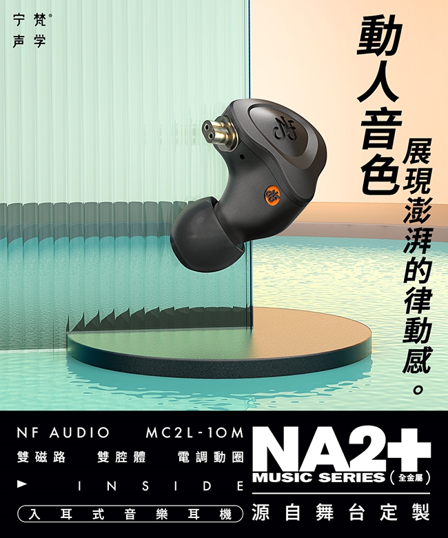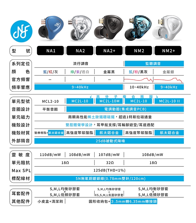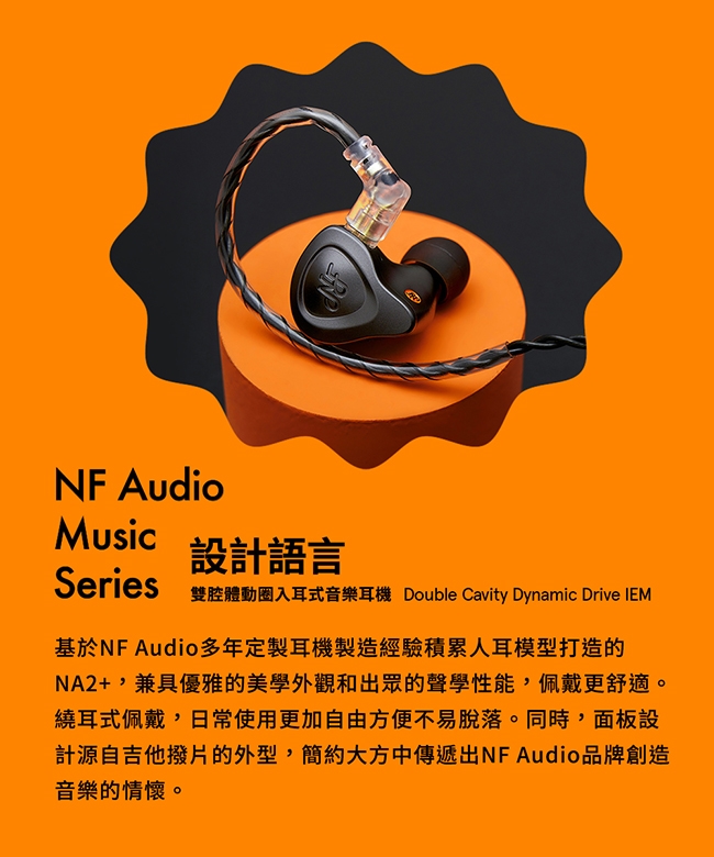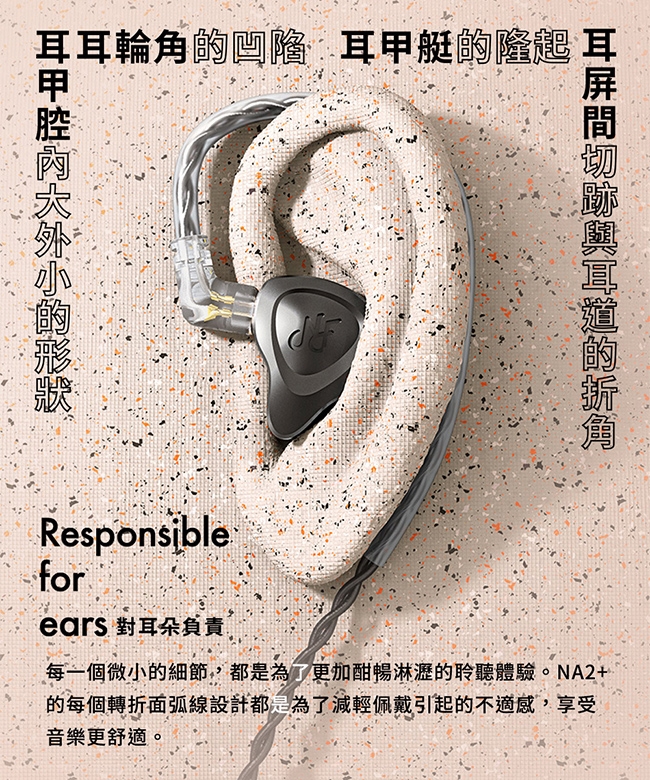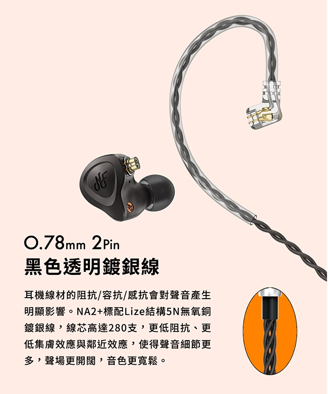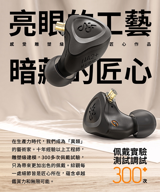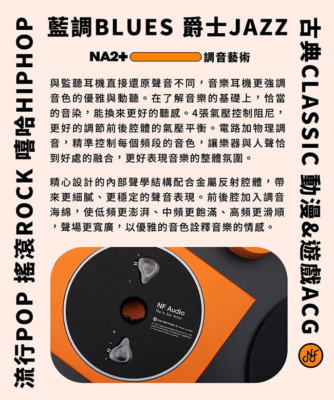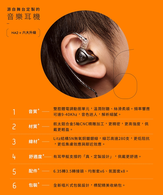 NA2+ 採用雙磁路雙腔體電調動圈單元,音色溫潤耐聽,頻率響應高達9-40Khz,