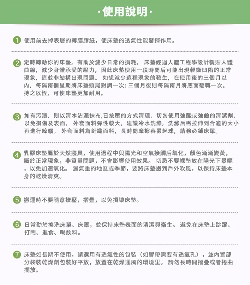 注意!不可水洗、不可日晒、不可乾洗、不可烘乾、不可漂白、不可接觸高溫高熱物品。直曬陽光會導致乳膠氧化分解,產生粉屑。高溫會使乳膠床墊變形變硬,縮短使用壽命,因此建議平常要保存在陰涼處。可以定期翻面使用。