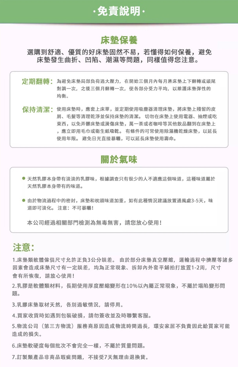 - 天然乳膠正常現象:天然乳膠採用發泡成型,在生產過程中,會產生不規則小洞、氣泡、注模孔、脫模缺口、切面不光滑等等屬於正常現象,並非質量問題,完全不影響使用。
