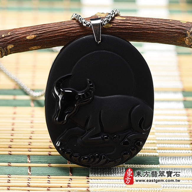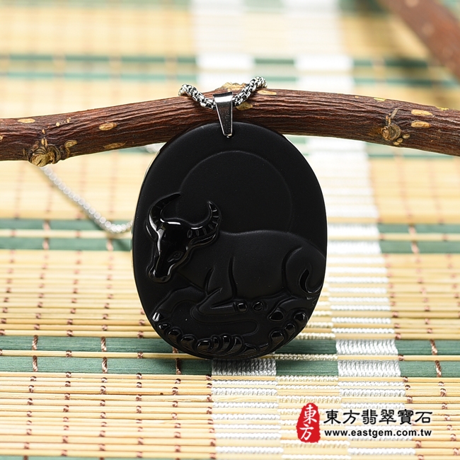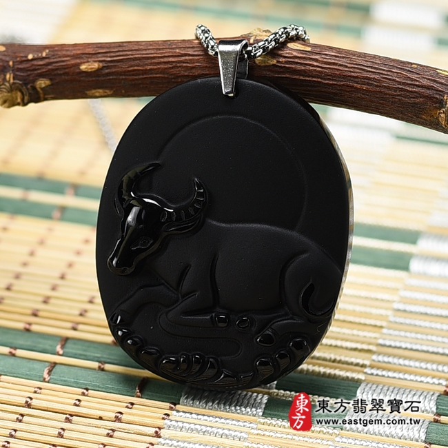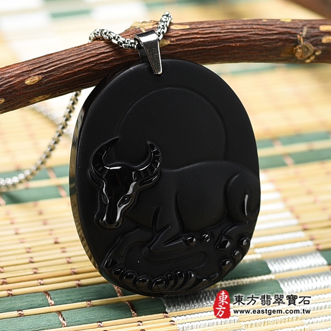 商品名稱:黑曜石牛項鍊玉珮(牛運亨通:牛牌黑曜石牛玉珮、黑曜石牛玉墜,牛十二生肖項鍊)。全黑黑曜石牛,CO034。客製化訂做各種黑曜石牛吊墜玉珮項鍊。★東方翡翠寶石保證卡