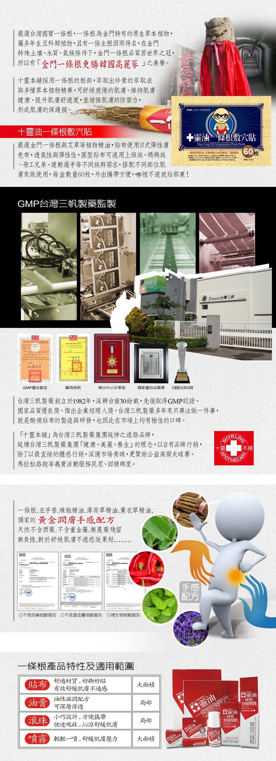 一條根為金門特有的原生草本植物,十靈本舖採用一條根的根部,萃取出珍貴的萃取液,可舒緩疲倦的肌膚、使肌膚恢復活力,維持肌膚健康,提升肌膚舒適度。艾草、肉桂、丁香植物萃取精華,使肌膚增強的防禦力,形成肌膚的保護膜。