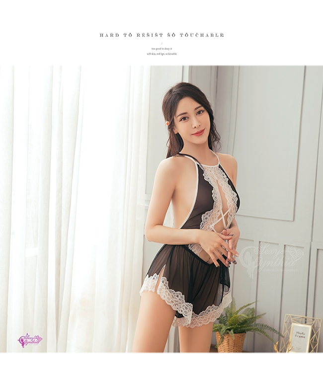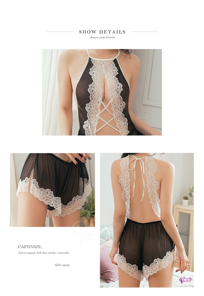 此款連身衣採用黑色薄紗材質,