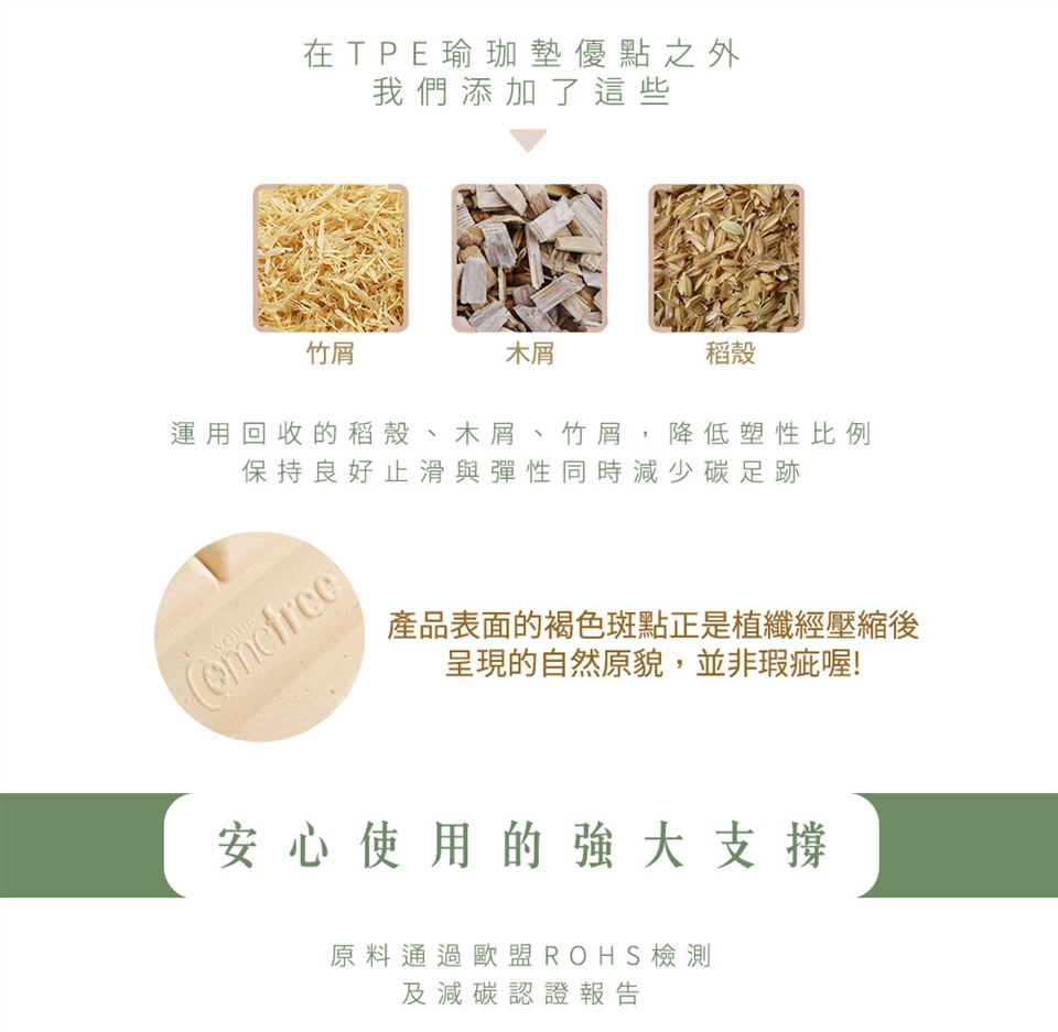 Comefree康芙麗─台灣國民運動品牌,全新推出添加可回收之植物纖維素材居家瑜珈健身系列商品,無染色,低塑料,運用回收的稻穀、木屑、竹屑,降低塑料比例,保持良好止滑與彈性同時減少碳足跡,原料通過SGS及減碳認證,保持最純粹的運動態度,使用環保又安心!