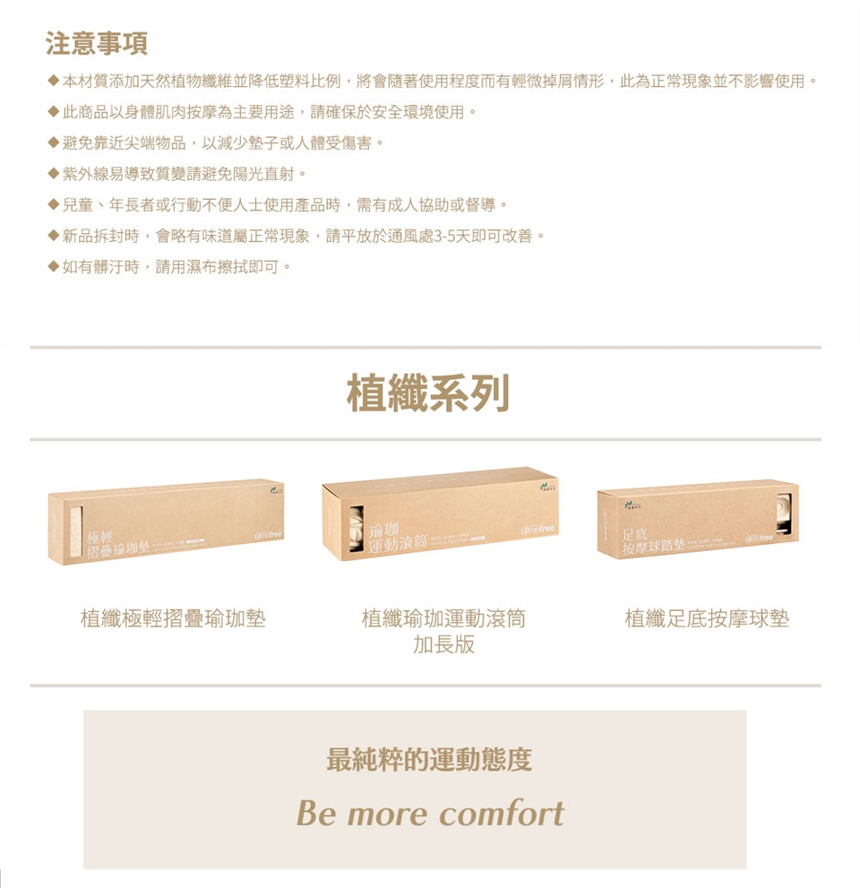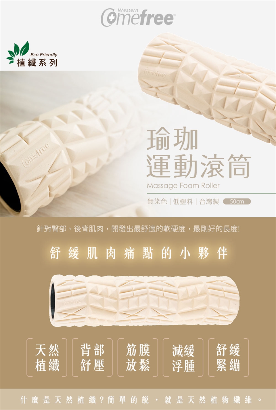滾開肌肉不適,運動才有下一次!Comefree植纖瑜珈運動按摩滾筒,針對臀部、後背肌肉,開發出最舒適的軟硬度、最剛好的長度!亦可使用於腓腸肌、股外側肌、臀部肌群等。