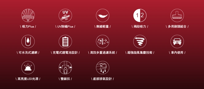 ◎內容物:主機、電動除螨刷、長管2條、旋轉地拖、毛刷吸頭、縫隙吸嘴、軟管、充電底座、充電器