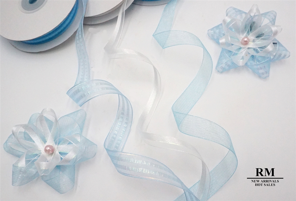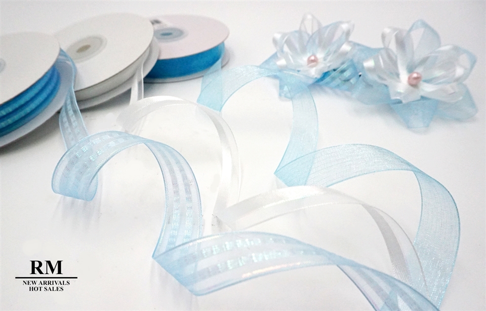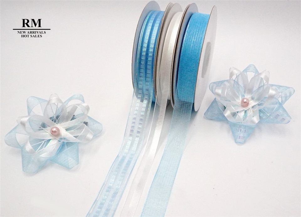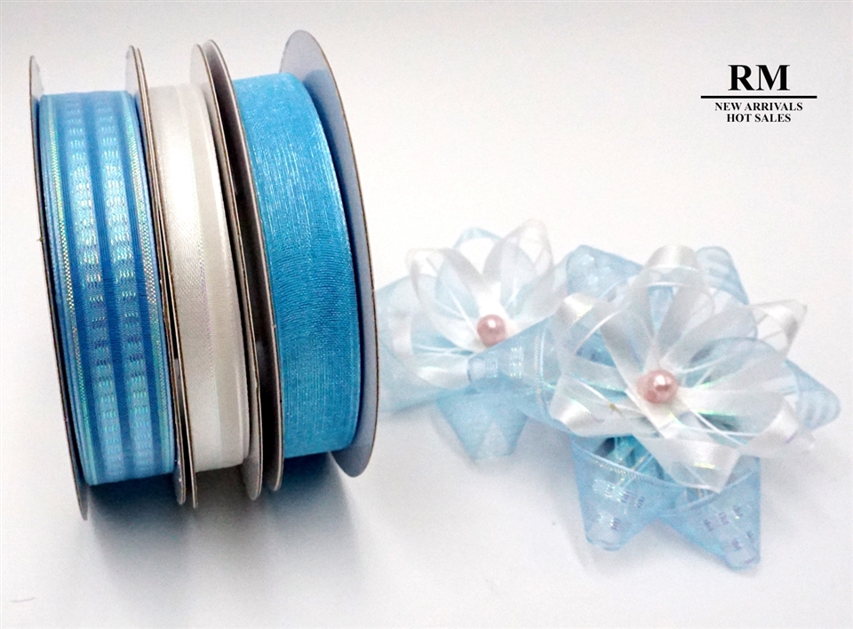三種緞帶組合的套組,清淨幽蘭的水藍色搭配純白半緞半紗雪紗帶,給妳最純淨的美好。