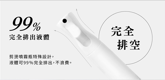 剪燙噴霧瓶特殊設計,液體可99%完全排出,不浪費