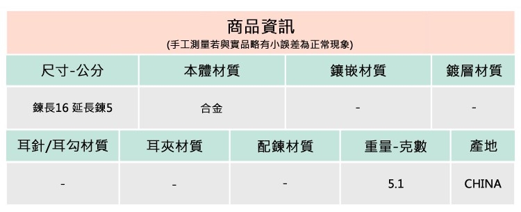 ◆合金飾品一經使用可能隨時間失去光澤或褪色,此為正常物理現象,妥善使用保存可延長飾品壽命。