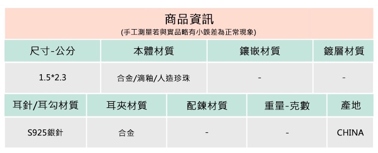 ◆合金飾品一經使用可能隨時間失去光澤或褪色,此為正常物理現象,妥善使用保存可延長飾品壽命。