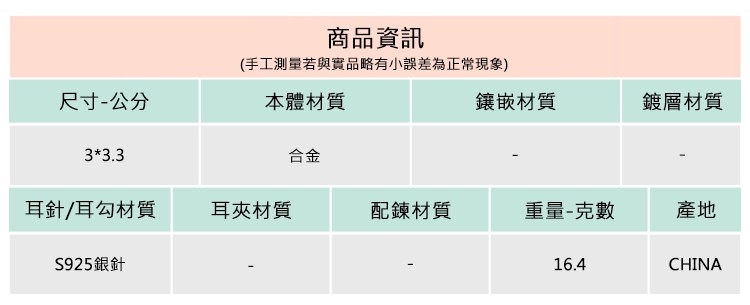 ◆合金飾品一經使用可能隨時間失去光澤或褪色,此為正常物理現象,妥善使用保存可延長飾品壽命。