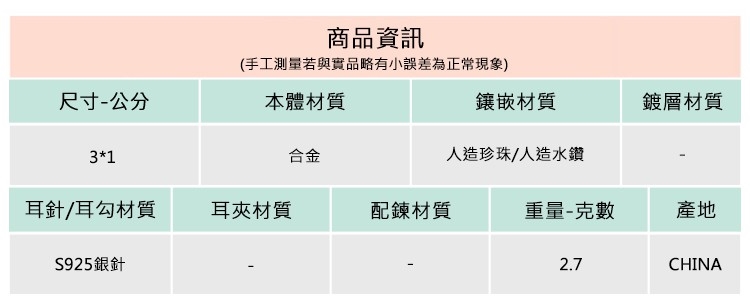 ◆合金飾品一經使用可能隨時間失去光澤或褪色,此為正常物理現象,妥善使用保存可延長飾品壽命。